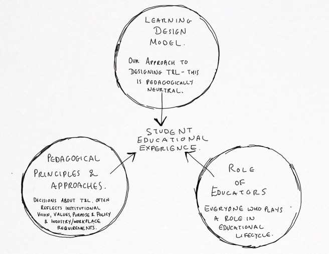 Over the past few months I have been working on the development of a framework to guide the transformative design of online education at my institution. To date the institution has been using a Learning Design model that focus’ on backwards design which is a neat and elegant approach for the design of online courses. Yet, Learning Design models are pedagogically neutral, and omit the art of teaching and learning (pedagogical principles and approaches), and the roles of the players (students, educators, community). Our transformation is from a largely transmissive approach to a participatory approach that puts the learner at the heart of what we do. Moving from content-based to outcomes-based ensures our assessments reflect the skills and knowledge students need for the workplace, and they will learn through solving problems, generating knowledge, inquiry, critical thinking and application of concepts. They will be given opportunities to work collaboratively and contextually, bringing their experience of the world into the modules they studying and undertaking tasks and reflections in the world as part of their learning activities. It is essential to build a clear pedagogy within our framework, and give attention to how educators and students are present and active online. In doing so we will be able to design in a way that is current for our time.